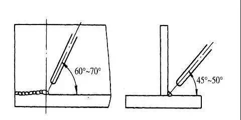 根部平角焊的焊条角度如图所示:采用右焊法,在试板左侧引弧,短弧焊。采用直线运条方式,向右焊接,电弧对准根部顶角,压低电弧,保证顶角和两侧板熔合。打底焊时摆动方法采用直线运条,不摆动快速焊接,这样可以达到所需要的熔深。